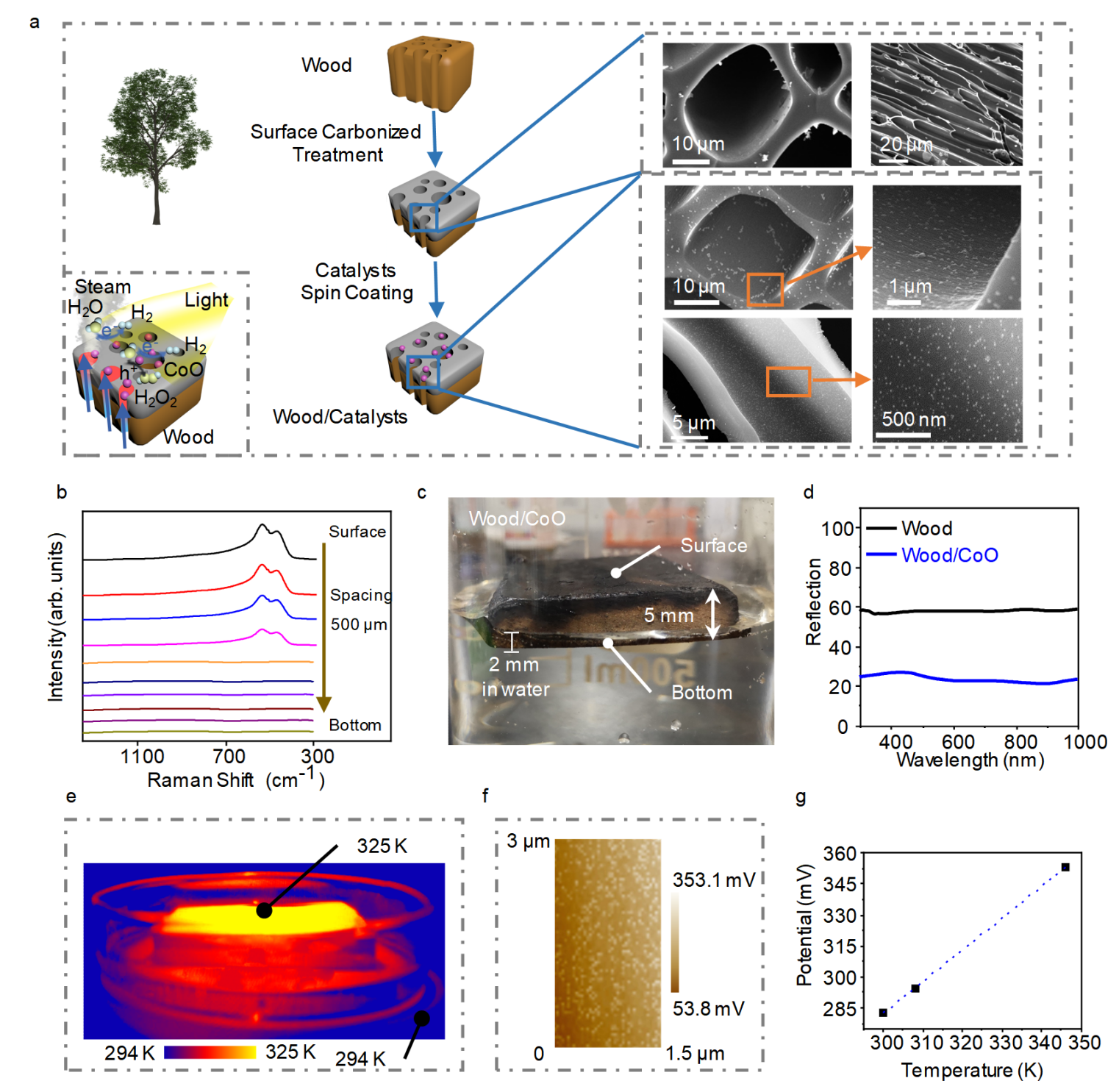 Professor Li Xuanhua in School of Materials Science and Engineering, NPU and the cooperation partners propose an efficient biphase photocatalytic system composed of integrated photothermal-photocatalytic materials that use charred wood substrates to convert liquid water to water steam, simultaneously split to hydrogen under light illumination without additional energy. The new photocatalytic system differs from the triphase interfaces of liquid water/solid photocatalyst/hydrogen gas, to realize the biphase interfaces of gas water/solid photocatalyst/hydrogen gas. This biphase system thermodynamically reduces the interface barrier in the adsorption process, and kinetically lowers the hydrogen gas's transport resistance against the environment. As a result, an impressive hydrogen production rate up to 85604 μmol h-1 g-1 in the particulate photocatalytic systems has been achieved based on the wood/CuS-MoS2 hetero-photocatalyst system, demonstrating that the photothermal-photocatalytic biphase system is cost-effective and greatly advantageous for practical applications.